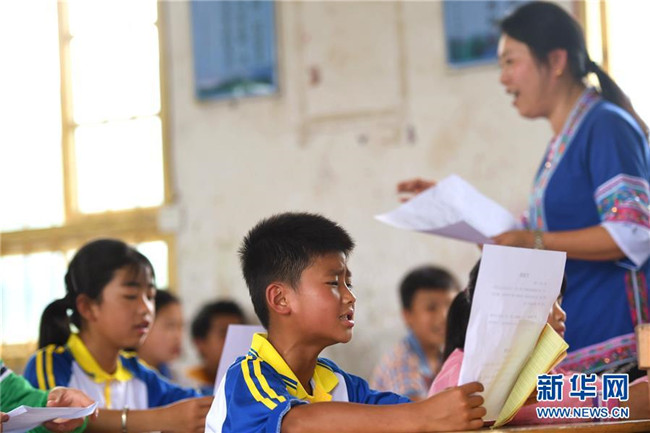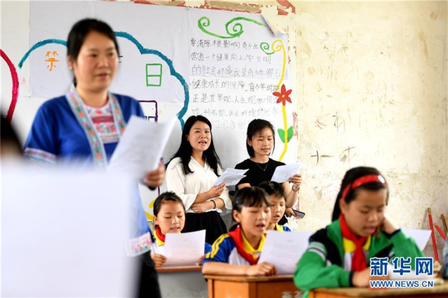 5月27日,在廣西柳州市三江侗族自治縣良口鄉(xiāng)燕茶村燕子小學(xué),吳純娟在教五年級的學(xué)生唱侗族大歌。