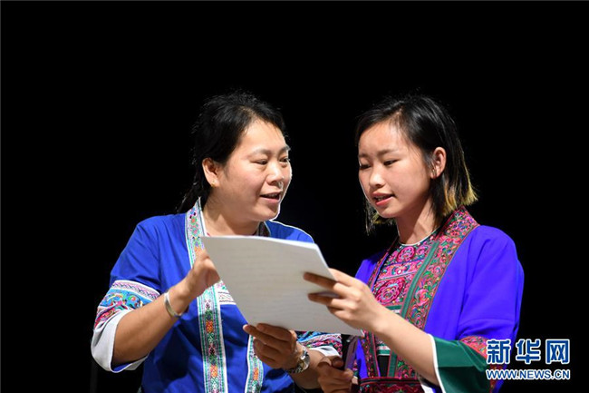 5月27日晚,在廣西柳州市三江侗族自治縣良口鄉(xiāng)燕茶村戲臺前,吳純娟(左)對楊雪連進(jìn)行發(fā)音指導(dǎo)。