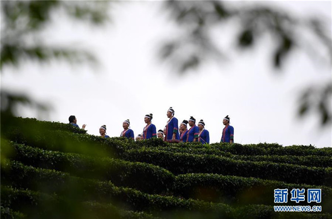 5月28日清晨,在廣西柳州市三江侗族自治縣良口鄉(xiāng)燕茶村,吳純娟(左一)在村后的茶園里與村民排練侗族大歌。