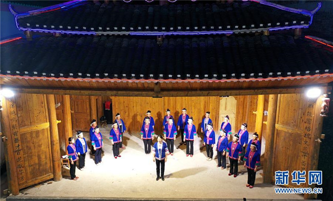 5月27日晚,在廣西柳州市三江侗族自治縣良口鄉(xiāng)燕茶村,吳純娟(前排中)與村民在戲臺上排練侗族大歌(無人機(jī)拍攝)。
