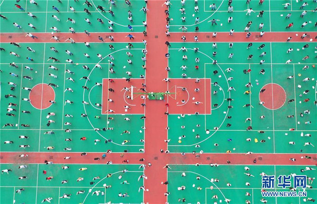 6月4日,在湖南省衡陽縣第一中學(xué),高三學(xué)生做早操(無人機(jī)拍攝)。新華社發(fā)(曹正平攝)