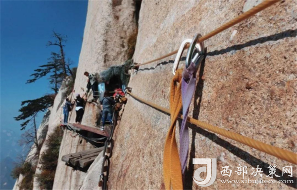 長空棧道位于華山南峰東側山腰,是華山派第一代宗師,元朝初年的賀志真為遠離塵世靜修成仙搭建而成。這段百余米懸空的棧道是在萬仞絕壁上鑿出來幾個踏腳之處,又在之上鑲嵌石釘搭木椽而筑,距今已經(jīng)有700多年的歷史,后人爬行至此都驚恐萬分。