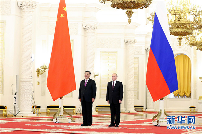 會談前,普京總統(tǒng)在克里姆林宮喬治大廳為習(xí)近平舉行隆重歡迎儀式。
