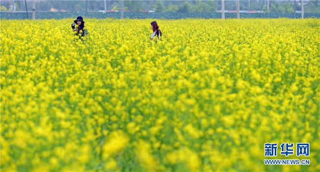 近日,在遼寧省沈陽市沈北新區(qū)時空東街與蒲民北路交叉口附近,成片的油菜花競相綻放,吸引眾多游客前來觀賞。 新華社記者 楊青 攝