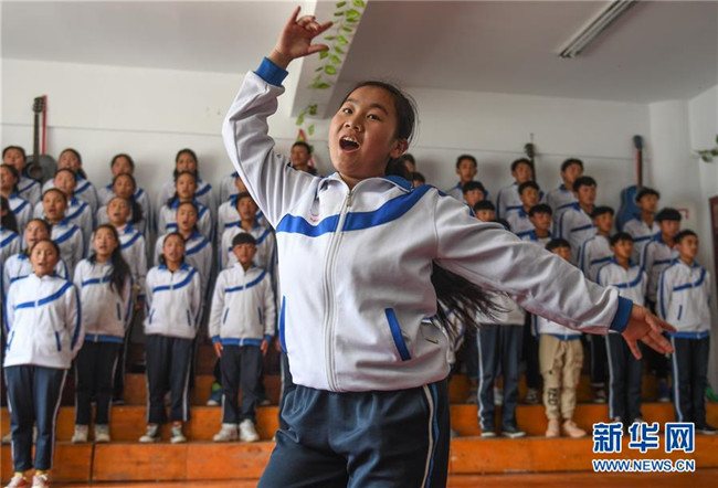 鹽井中學的學生們在上藏文課(6月6日攝)。年輕的藏族女教師坐在鋼琴前,手指靈動地彈奏樂曲,兩名學生拉起弦子伴奏,三十多名學生站成四排,齊聲合唱。學?;@球場上數名身材高大的學生,正在體育老師的組織下進行激烈的分組對抗,不一會兒,學生們個個汗流浹背。綜合樓三樓的化學實驗室內,身穿白色大褂的學生,分成若干小組,正在做簡單的化學實驗。這一幕幕,同時出現在西藏昌都市芒康縣鹽井中學。新華社記者晉美多吉攝