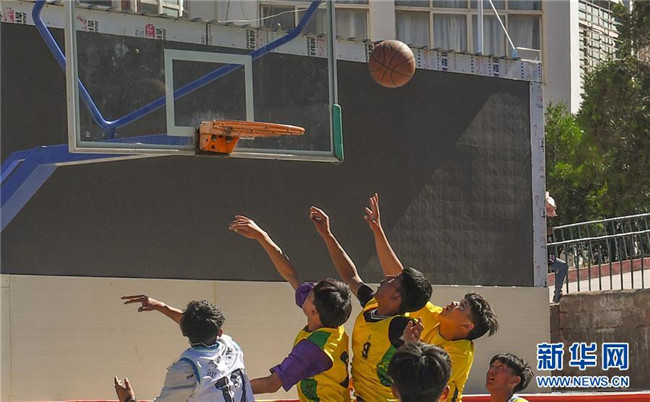 鹽井中學的學生們在體育課上打籃球(6月6日攝)。年輕的藏族女教師坐在鋼琴前,手指靈動地彈奏樂曲,兩名學生拉起弦子伴奏,三十多名學生站成四排,齊聲合唱。學?;@球場上數名身材高大的學生,正在體育老師的組織下進行激烈的分組對抗,不一會兒,學生們個個汗流浹背。綜合樓三樓的化學實驗室內,身穿白色大褂的學生,分成若干小組,正在做簡單的化學實驗。這一幕幕,同時出現在西藏昌都市芒康縣鹽井中學。新華社記者晉美多吉攝
