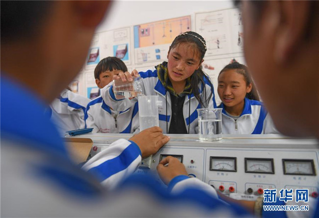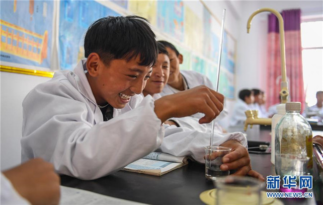 鹽井中學的學生們在上化學課(6月6日攝)。年輕的藏族女教師坐在鋼琴前,手指靈動地彈奏樂曲,兩名學生拉起弦子伴奏,三十多名學生站成四排,齊聲合唱。學?;@球場上數名身材高大的學生,正在體育老師的組織下進行激烈的分組對抗,不一會兒,學生們個個汗流浹背。綜合樓三樓的化學實驗室內,身穿白色大褂的學生,分成若干小組,正在做簡單的化學實驗。這一幕幕,同時出現在西藏昌都市芒康縣鹽井中學。新華社記者晉美多吉攝