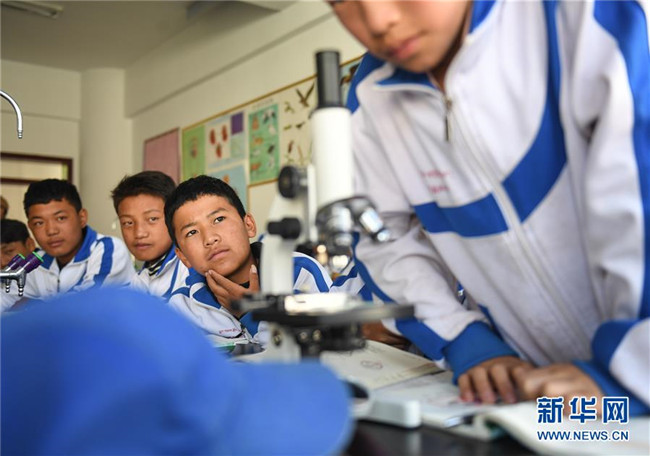 鹽井中學的學生們在上生物課(6月6日攝)。年輕的藏族女教師坐在鋼琴前,手指靈動地彈奏樂曲,兩名學生拉起弦子伴奏,三十多名學生站成四排,齊聲合唱。學?;@球場上數名身材高大的學生,正在體育老師的組織下進行激烈的分組對抗,不一會兒,學生們個個汗流浹背。綜合樓三樓的化學實驗室內,身穿白色大褂的學生,分成若干小組,正在做簡單的化學實驗。這一幕幕,同時出現在西藏昌都市芒康縣鹽井中學。新華社記者晉美多吉攝