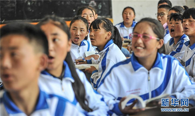 鹽井中學的學生們在上英語課(6月6日攝)。年輕的藏族女教師坐在鋼琴前,手指靈動地彈奏樂曲,兩名學生拉起弦子伴奏,三十多名學生站成四排,齊聲合唱。學?;@球場上數名身材高大的學生,正在體育老師的組織下進行激烈的分組對抗,不一會兒,學生們個個汗流浹背。綜合樓三樓的化學實驗室內,身穿白色大褂的學生,分成若干小組,正在做簡單的化學實驗。這一幕幕,同時出現在西藏昌都市芒康縣鹽井中學。新華社記者晉美多吉攝
