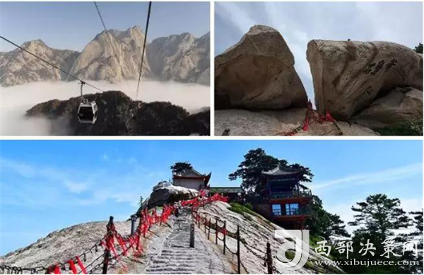 華山著名景區(qū)多達(dá)210余處,有凌空架設(shè)的長空棧道,三面臨空的鷂子翻身,以及在峭壁絕崖上鑿出的千尺幢、百尺峽、老君犁溝等,其中華岳仙掌被列為關(guān)中八景之首。