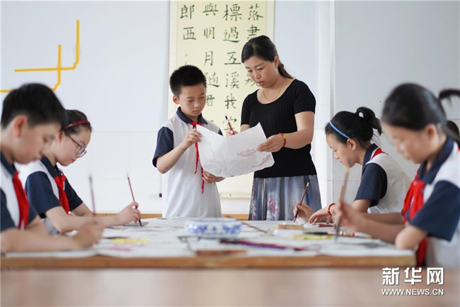 6月26日,內(nèi)丘縣實驗小學(xué)老師在指導(dǎo)學(xué)生練習(xí)國畫創(chuàng)作。新華社記者 朱旭東 攝