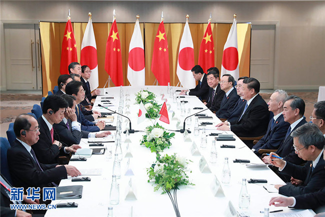 習(xí)近平強(qiáng)調(diào),雙方要始終恪守中日四個(gè)政治文件確立的各項(xiàng)原則,踐行中日“互為合作伙伴、互不構(gòu)成威脅”的政治共識(shí),增進(jìn)互信,推動(dòng)中日關(guān)系始終沿著和平、友好、合作的正確軌道持續(xù)向前發(fā)展。要深化經(jīng)貿(mào)、投資、第三方市場、科技創(chuàng)新等廣泛領(lǐng)域合作,打造新的合作增長點(diǎn),積極引領(lǐng)區(qū)域經(jīng)濟(jì)一體化。我們歡迎日本企業(yè)積極擴(kuò)大對(duì)華合作,分享中國發(fā)展新機(jī)遇。共建“一帶一路”倡議為中日互利合作開辟了廣闊天地,歡迎日方積極參與。雙方要拉緊人文紐帶,加強(qiáng)兩國青少年交流,促進(jìn)兩國民眾相知相親。我贊同年內(nèi)啟動(dòng)中日高級(jí)別人文交流磋商機(jī)制。要通過對(duì)話協(xié)商建設(shè)性管控矛盾分歧,加強(qiáng)外交和安全領(lǐng)域?qū)υ挘瑯?gòu)建建設(shè)性雙邊安全關(guān)系。希望日方恪守迄今共識(shí)和承諾,妥善處理好歷史等敏感問題,共同維護(hù)東海和平穩(wěn)定。中日應(yīng)該加強(qiáng)在國際和地區(qū)事務(wù)中的溝通、協(xié)調(diào)、合作,共同應(yīng)對(duì)全球性挑戰(zhàn),推動(dòng)全球治理更加公正合理。中方支持日方辦好二十國集團(tuán)領(lǐng)導(dǎo)人大阪峰會(huì),期待峰會(huì)發(fā)出維護(hù)多邊主義和自由貿(mào)易的明確聲音,為世界經(jīng)濟(jì)發(fā)展注入穩(wěn)定預(yù)期和動(dòng)力。
