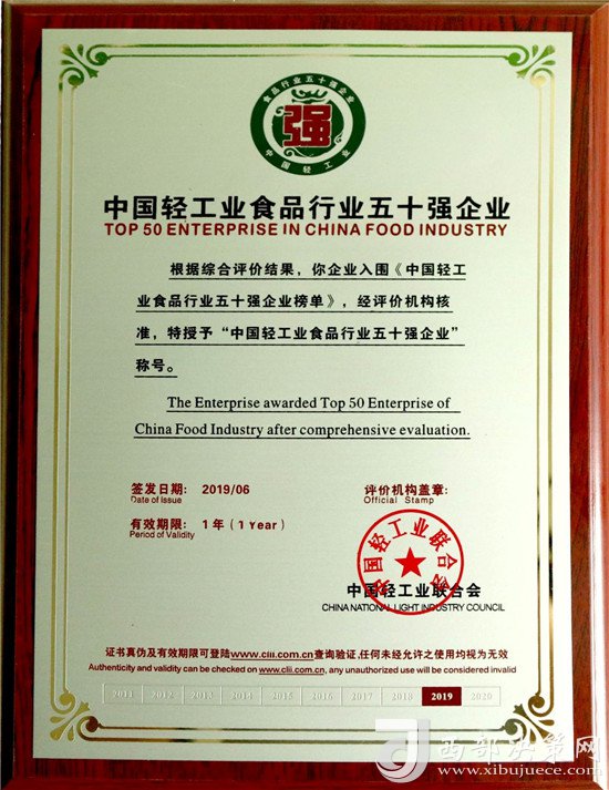 近日,由中國輕工業(yè)聯(lián)合會主辦,主題為“強化科技創(chuàng)新,服務美好生活”的“中國輕工業(yè)百強企業(yè)高峰論壇”在北京召開。會上,中國輕工業(yè)聯(lián)合會公布了2018年度中國輕工業(yè)食品行業(yè)五十強企業(yè),西鳳股份公司憑借良好的發(fā)展業(yè)績、市場口碑、行業(yè)競爭力及日益增強的品牌影響力,被中國輕工業(yè)聯(lián)合會授予“中國輕工業(yè)食品行業(yè)五十強企業(yè)”榮譽稱號,并受到表彰獎勵。