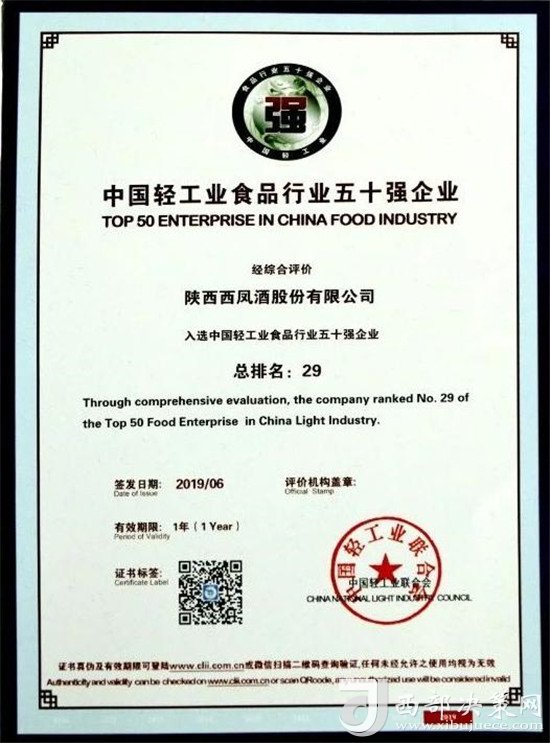 “中國輕工業(yè)食品行業(yè)五十強企業(yè)”榜單是評價輕工業(yè)食品企業(yè)競爭力的權威榜單,也是衡量中國輕工業(yè)食品企業(yè)發(fā)展活力的重要標準。此次榜單在評選標準上重點考量了2018年度參評企業(yè)的營業(yè)收入、利潤總額、營業(yè)收入利潤率、稅收占利稅比重、研發(fā)投入及營業(yè)收入增速六項指標綜合評分,力求結合互聯(lián)網(wǎng)時代特征對企業(yè)進行充分全面的評估,要求企業(yè)不僅能夠實現(xiàn)均衡發(fā)展,還要具備較強的市場活力。西鳳股份公司憑借出色的經(jīng)營業(yè)績和綜合表現(xiàn),獲得了大會的一致認可。