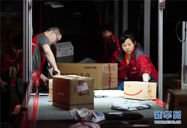 工人在位于西安的京東智能物流中心細(xì)分區(qū)龍門(mén)架下整理包裹(6月3日攝)。龍門(mén)架掃描后,包裹的出庫(kù)物流信息將自動(dòng)更新。新華社記者 邵瑞 攝