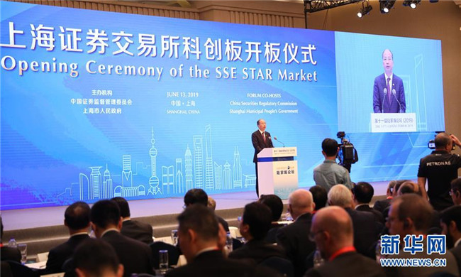 6月13日,上海證券交易所科創(chuàng)板開(kāi)板儀式在陸家嘴論壇上舉行。這是中國(guó)證監(jiān)會(huì)主席易會(huì)滿在開(kāi)板儀式上致辭。新華社記者 方喆 攝