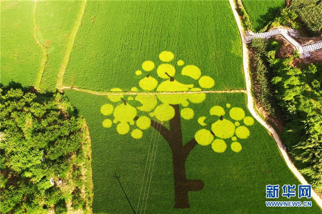仲夏時(shí)節(jié),在重慶忠縣新立鎮(zhèn)中嶺社區(qū)出現(xiàn)水稻拼成的“笑臉”“橘子”等圖案,成為一道靚麗的鄉(xiāng)村田園風(fēng)景線(xiàn)。新華社記者 王全超 攝