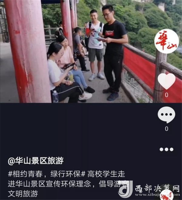 活動還通過高校網絡紅人拍攝抖音“青春最美,華山見證”主題短視頻等傳播方式,在網絡線上形成熱度,為華山綠色環(huán)保游提供了新方式。