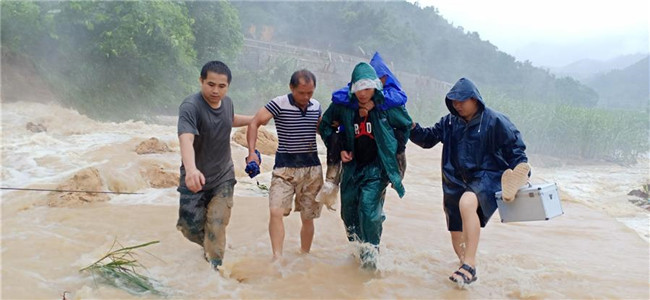 隨行的一名工作人員用相機定格了這樣一個瞬間:滔滔洪水中,一名干部背著覃愛芝,身旁三名拿著醫(yī)藥箱和其他物品的干部互相攙扶著前行。幾名干部的衣服已經濕透,身上全是泥巴,而覃愛芝穿著雨衣,傷口還被塑料袋包裹著。