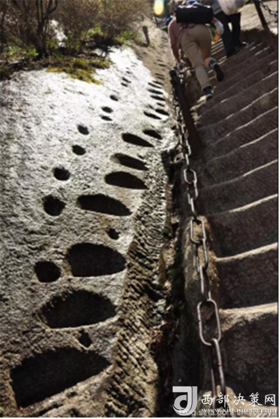 第二道險關(guān)是百尺峽。這里兩壁高聳,中間夾著一塊從天而降的巨石,上刻“驚心石”三個大字,游人從石下小路穿過,確實驚心動魄。第三道險關(guān)是老君犁溝,這是夾在陡峭石壁之間的一條溝狀險道,有570多個石階。相傳這里原先根本沒有路,太上老君見了,就將手中的如意柄變成一張鐵犁, 又牽來青牛,一夜間犁成了這條山溝。傳說青牛犁完溝后,見華山景色壯美,便化為石牛,永遠地留在了華山之上。溝的盡頭是一道陡壁, 名為“猢猻愁”。顧名思義,連猴子都發(fā)愁,可見這里的山勢多么陡峭。