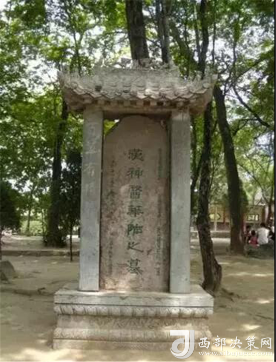 神醫(yī)華佗墓,在石舫東邊的巨石旁,有一《漢神醫(yī)華陀墓》碑。華陀死后并沒葬于此,但為什么有墓碑呢?據(jù)《后漢書•華陀傳》記載:當(dāng)年華陀有一好友名魯先生隱居在華山白麓龕,華陀常來華山探友,且常留住這里,和魯先生一起作五禽游戲,一起采藥、制藥濟(jì)世。他在平時(shí)總愛穿戴魯先生的道袍方巾,腰系一個(gè)大藥葫蘆,下山為百姓診治疾病。被曹操殺害后,冤魂直來華山,向好友訴屈。魯先生驚覺,即下山探詢,獲得確實(shí)噩耗后,魯先生把華陀衣物用具在紅巖村西修了一座衣冠冢,并且嚎啕痛哭送葬。現(xiàn)墓已無存,也不知何時(shí)何人將墓碑移至玉泉院內(nèi)。