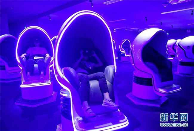 7月24日,家長(zhǎng)和孩子在湖南省博物館通過虛擬現(xiàn)實(shí)設(shè)備觀影。