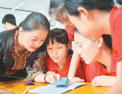 國家級非遺項(xiàng)目瑤族服飾傳承人李素芳(左一)指導(dǎo)營員編織瑤繡