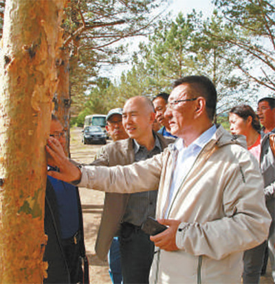 于??。ㄇ埃┡c苗木專家在察看林場樹木。新華社發(fā)