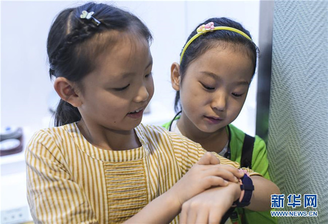 在新疆博物館的講解結(jié)束后,一名小游客通過(guò)電話手表和文藝揚(yáng)(右)合影留念(8月8日攝)。 新華社記者 王菲 攝