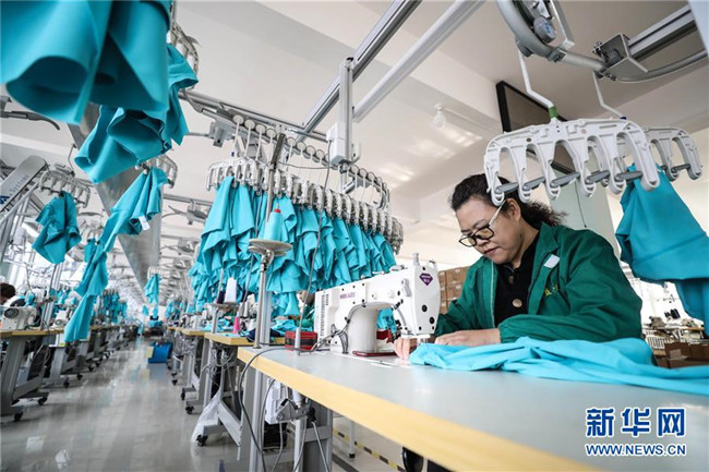 3月6日,工人在葫蘆島益豐(集團(tuán))運(yùn)動服飾有限公司生產(chǎn)車間加工泳衣。新華社記者 潘昱龍 攝