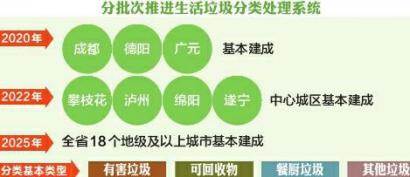 征求意見稿提出將加快建立分類投放、分類收集、分類運輸、分類處置的生活垃圾處理系統(tǒng),促進城鄉(xiāng)生活垃圾減量化、資源化、無害化,統(tǒng)籌推進其他固體廢物處理處置,努力改善城鄉(xiāng)人居環(huán)境。到2020年,成都、德陽、廣元3個國家重點城市基本建成生活垃圾分類處理系統(tǒng),生活垃圾回收利用率達到35%以上;到2022年,攀枝花、瀘州、綿陽、遂寧4個省級示范城市的中心城區(qū)基本建成生活垃圾分類處理系統(tǒng);到2025年,全省18個地級及以上城市基本建成生活垃圾分類處理系統(tǒng)。