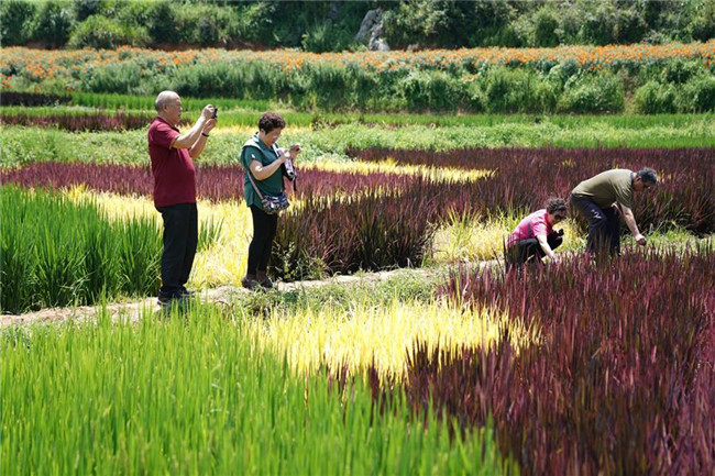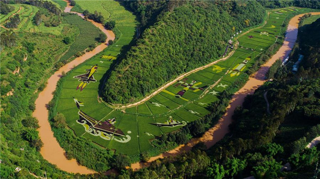 云南省昆明市宜良縣著力打造創(chuàng)意農(nóng)業(yè)、景觀農(nóng)業(yè)、實(shí)現(xiàn)“以農(nóng)帶旅、以旅興農(nóng)”的產(chǎn)業(yè)發(fā)展,其中種植的數(shù)百畝彩色稻田,在田間繪制了各類美麗畫卷,吸引眾多游客前來(lái)觀光。 新華社記者 秦晴 攝