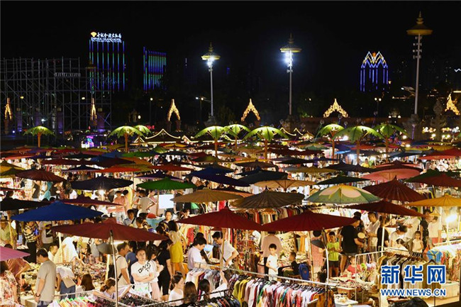 8月16日,在西雙版納傣族自治州景洪市,游客在瀾滄江畔的夜市休閑購(gòu)物。新華社記者 楊宗友 攝