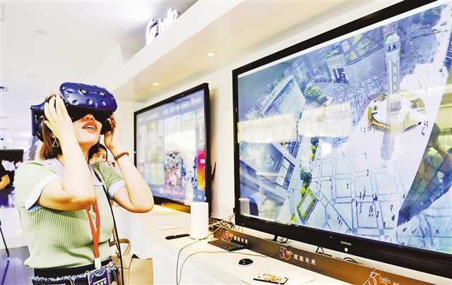 8月15日,在中國電信重慶公司,體驗者頭戴VR設(shè)備,觀看解放碑的實時全景。在未來,5GVR將會在智慧旅游、遠(yuǎn)程教育、遠(yuǎn)程會議等多領(lǐng)域應(yīng)用。(本組圖片均由記者張錦輝攝)