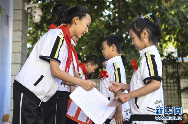 9月4日,新疆教育學(xué)院實(shí)驗(yàn)小學(xué)校園內(nèi),一年級(jí)新生與六年級(jí)學(xué)生互換心愿卡并鞠躬行禮。
