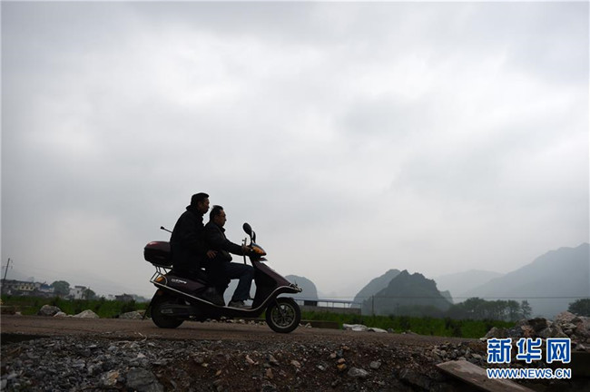 在廣西灌陽縣洞井瑤族鄉(xiāng),桂平巖小學(xué)老師趙仁斌(前)用電單車將楊大杰老師載去學(xué)校的路上(2016年3月24日攝)。2015年3月,楊大杰被診斷為股骨頭壞死,經(jīng)過一段時間治療病情有所緩解后,他堅(jiān)持帶病回到教學(xué)崗位上。新華社記者 陸波岸 攝