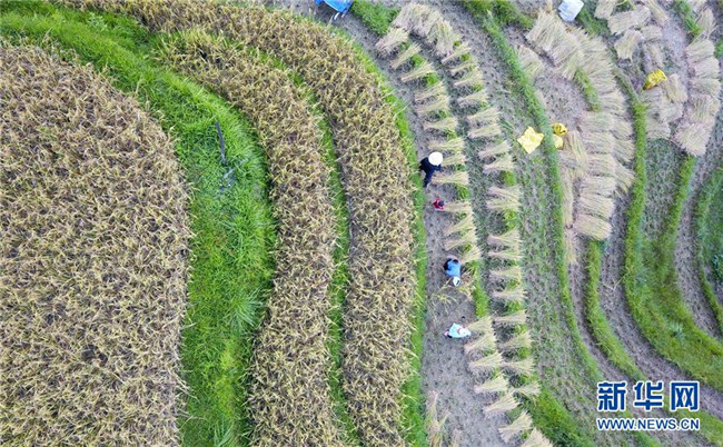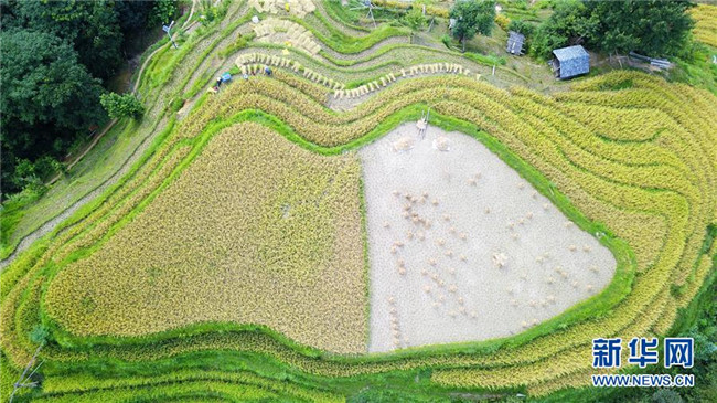 近日,貴州省黔東南苗族侗族自治州榕江縣計(jì)劃鄉(xiāng)計(jì)劃村陽(yáng)開苗寨的水稻陸續(xù)成熟,農(nóng)民們搶抓農(nóng)時(shí)收割稻谷。從空中俯瞰,層層疊疊的梯田線條分明,與古樸的苗寨木樓相互映襯,美不勝收。 新華社記者 楊文斌 攝