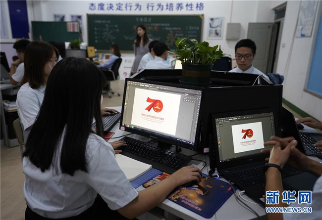 9月18日,邢臺技師學院的學生在平面設(shè)計課程上臨摹慶祝中華人民共和國成立70周年活動標識。