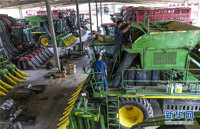 在位于新疆生產(chǎn)建設兵團第六師五家渠市的新疆準噶爾銀豐農(nóng)機裝備有限公司內(nèi),檢修人員在檢修保養(yǎng)采棉機(7月31日攝)。 新華社記者 王菲 攝