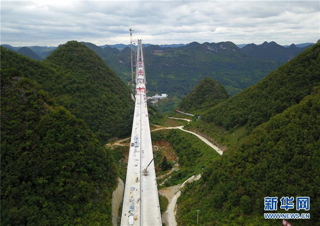 當(dāng)日,332米高的全球最高混凝土橋塔——貴州平塘至羅甸高速公路控制性工程平塘特大橋成功合龍。記者從貴州省交通運(yùn)輸廳了解到,平塘特大橋全長2135米,橋面寬30.2米,規(guī)劃雙向4車道,是一座三塔雙索面疊合梁斜拉橋。三座橋塔的高度分別為320米、332米和298米,相當(dāng)于在峽谷之中建了三座100多層高的大樓。平塘特大橋于2016年4月開工建設(shè),2018年11月橋塔順利封頂,計(jì)劃總工期為42個月,總投資15億元。此次合龍后,還要進(jìn)行橋面施工和欄桿等工程建設(shè),預(yù)計(jì)今年底全橋通車,屆時平塘到羅甸的通行時間將從2個半小時縮短至1小時,將成為連接貴州南部的交通要道,對助推滇黔桂石漠化片區(qū)脫貧攻堅(jiān)具有重要意義。新華社記者楊文斌攝