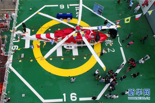 10月14日,“雪龍2”號向深圳市民開放。這是市民在參觀“雪龍2”號新配備的“雪鷹301”直升機(jī)(無人機(jī)拍攝)。新華社記者 劉詩平 攝