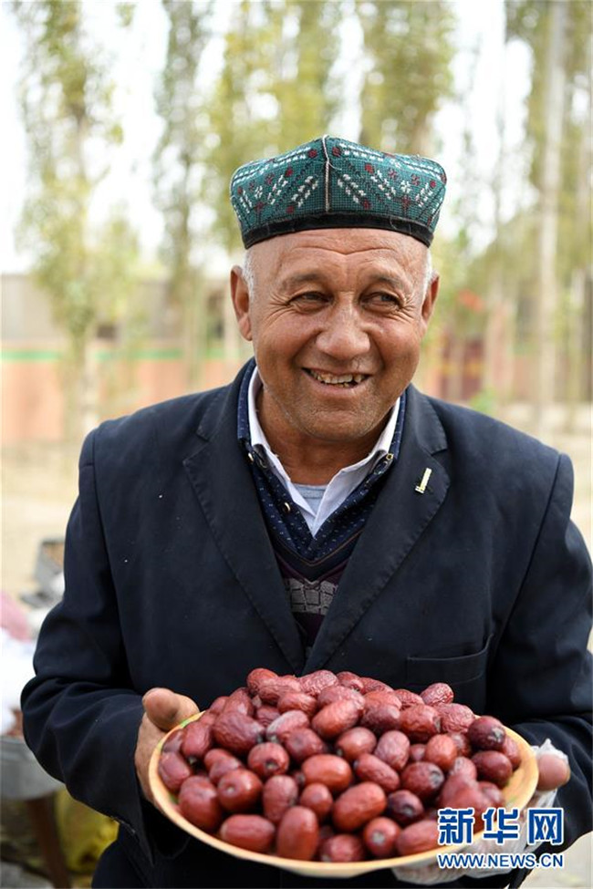 10月19日,新疆且末縣英吾斯塘鄉(xiāng)阿瓦提村的村民阿布力孜·伊敏展示自家的紅棗。