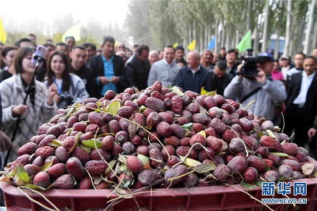 當(dāng)日,新疆且末縣英吾斯塘鄉(xiāng)阿瓦提村有機(jī)紅棗園開展紅棗采摘及直播代言活動(dòng),通過在棗園舉行打棗儀式、客人現(xiàn)場(chǎng)采摘等活動(dòng)慶豐收。 新華社記者沙達(dá)提攝