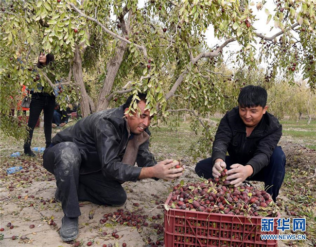 10月19日,在新疆且末縣英吾斯塘鄉(xiāng)阿瓦提村有機(jī)紅棗園,圖爾蓀江·吾布力(右)和喀斯木·艾薩在采摘紅棗。