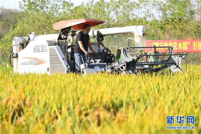 在第三代雜交水稻新組合試驗(yàn)示范衡南基地一塊被抽取測產(chǎn)的示范田里,工作人員進(jìn)行機(jī)械化收割測產(chǎn)(10月21日攝)。 新華社記者 陳澤國 攝