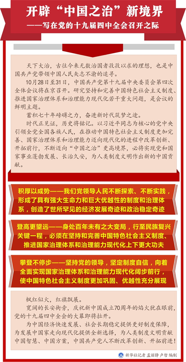 10月28日至31日,中國(guó)共產(chǎn)黨第十九屆中央委員會(huì)第四次全體會(huì)議將在京召開(kāi)。研究堅(jiān)持和完善中國(guó)特色社會(huì)主義制度、推進(jìn)國(guó)家治理體系和治理能力現(xiàn)代化若干重大問(wèn)題,是會(huì)議的鮮明主題。