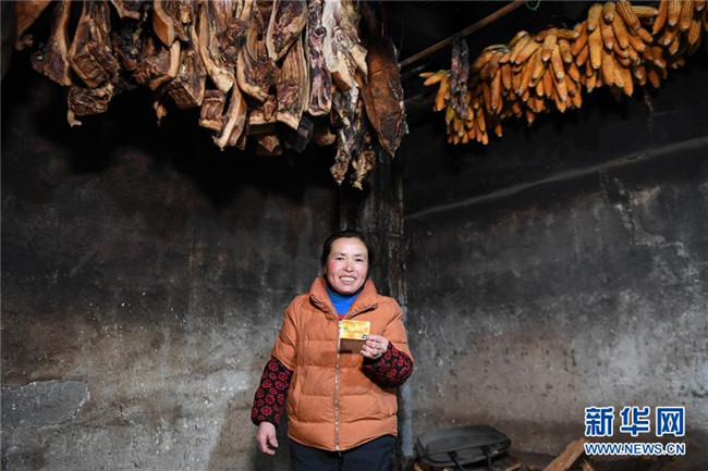 湖南龍山縣翻身村村民李紅云在展示自家的儲(chǔ)蓄卡(3月10日攝)。新華社記者 薛宇舸 攝