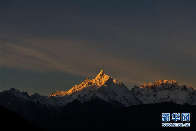 日出時(shí)分,陽(yáng)光照射在梅里雪山緬茨姆峰上(11月8日攝)。