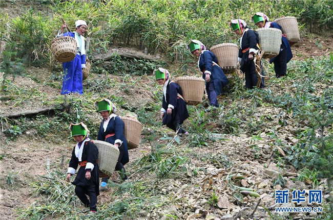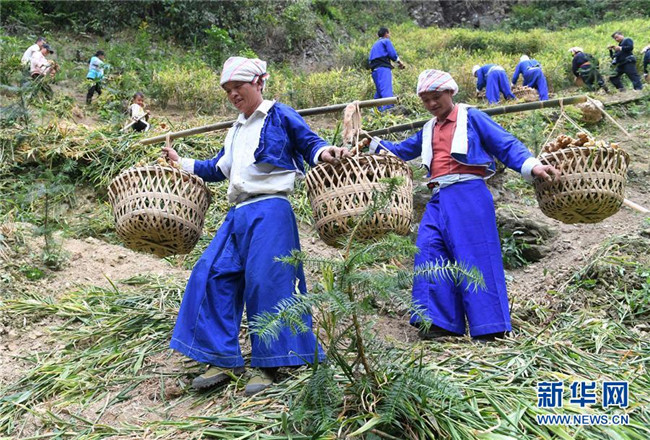 11月12日,廣西賀州市平桂區(qū)鵝塘鎮(zhèn)槽碓村的土瑤群眾將收獲的大肉姜挑下山。