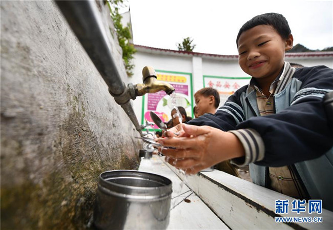 在廣西大化瑤族自治縣板升鄉(xiāng)八好小學(xué),同學(xué)們?cè)谟米詠?lái)水洗餐具(11月13日攝)。 新華社記者 黃孝邦 攝